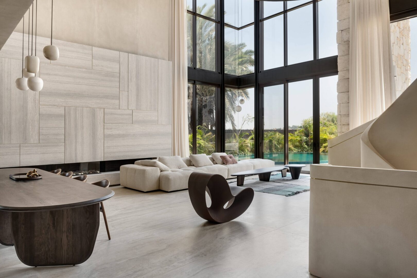 חלל המגורים הוא חלל פתוח עוצר נשימה, עם גבהי תקרה מעל הסלון המתנשאים לגובה שבעה מטרים. העיניים נמשכות מיד לעבר גרם המדרגות, אלמנט פיסולי דרמטי הכולל צורות גיאומטריות ואמורפיות כאחד. כדי להתחבר אל החוץ, הותקנו חלונות צרפתיים גדולים לאורך חזית פינתית שלמה כדי להשקיף על הגן, הפטיו ובריכת השחייה של הנכס. עם חומרים בגוונים טבעיים, החלל משדר אווירה של אלגנטיות עדינה.