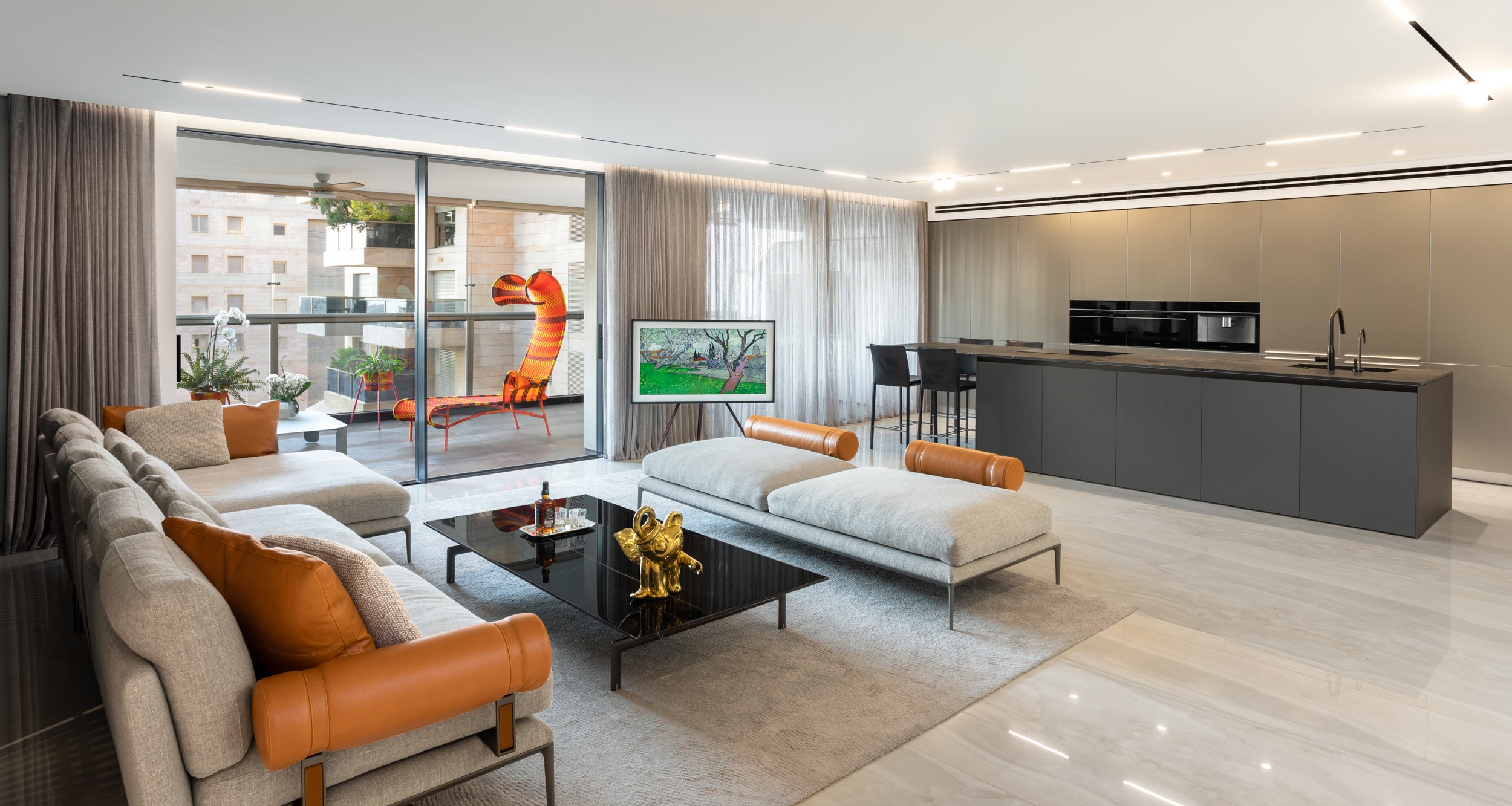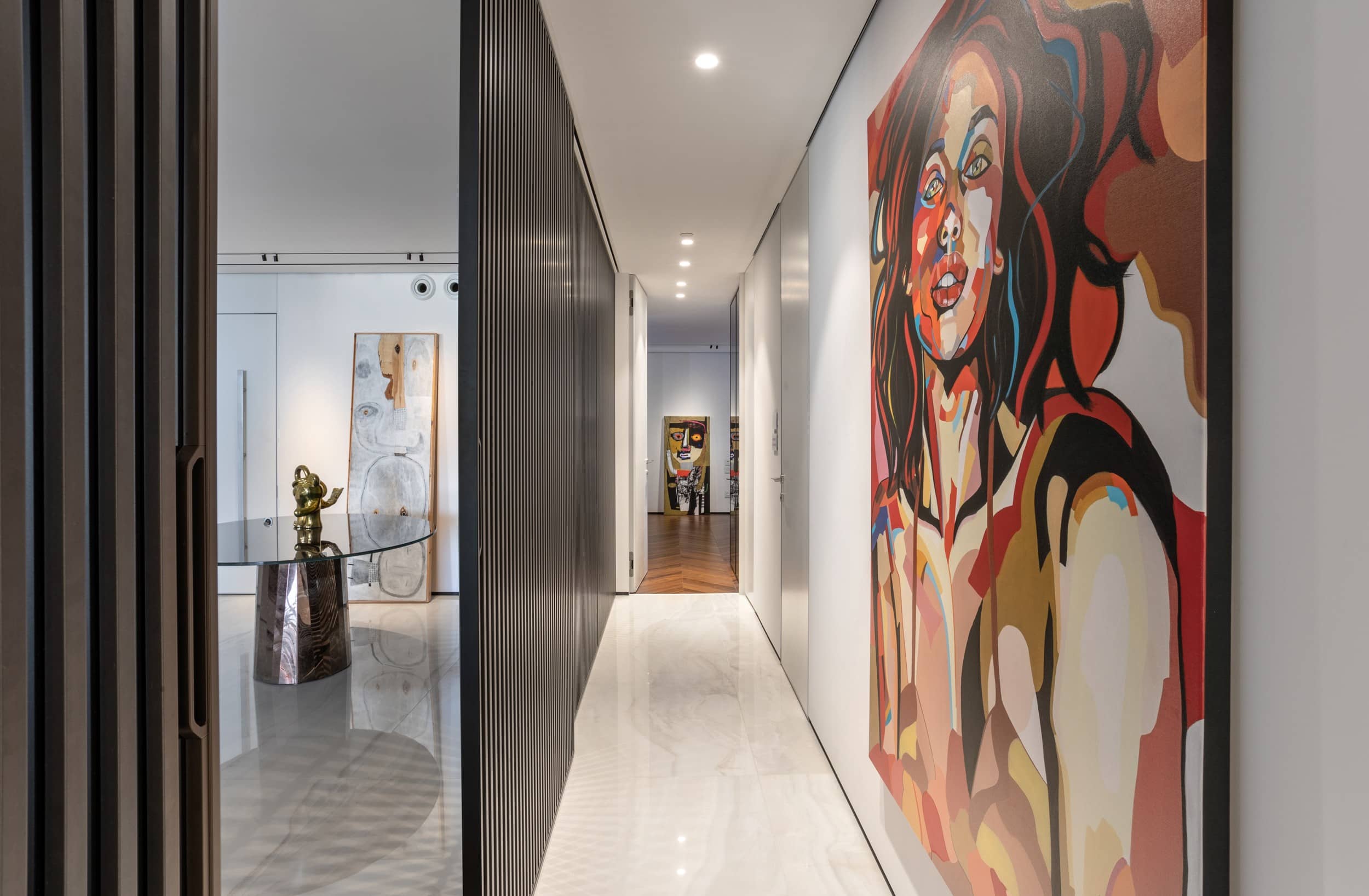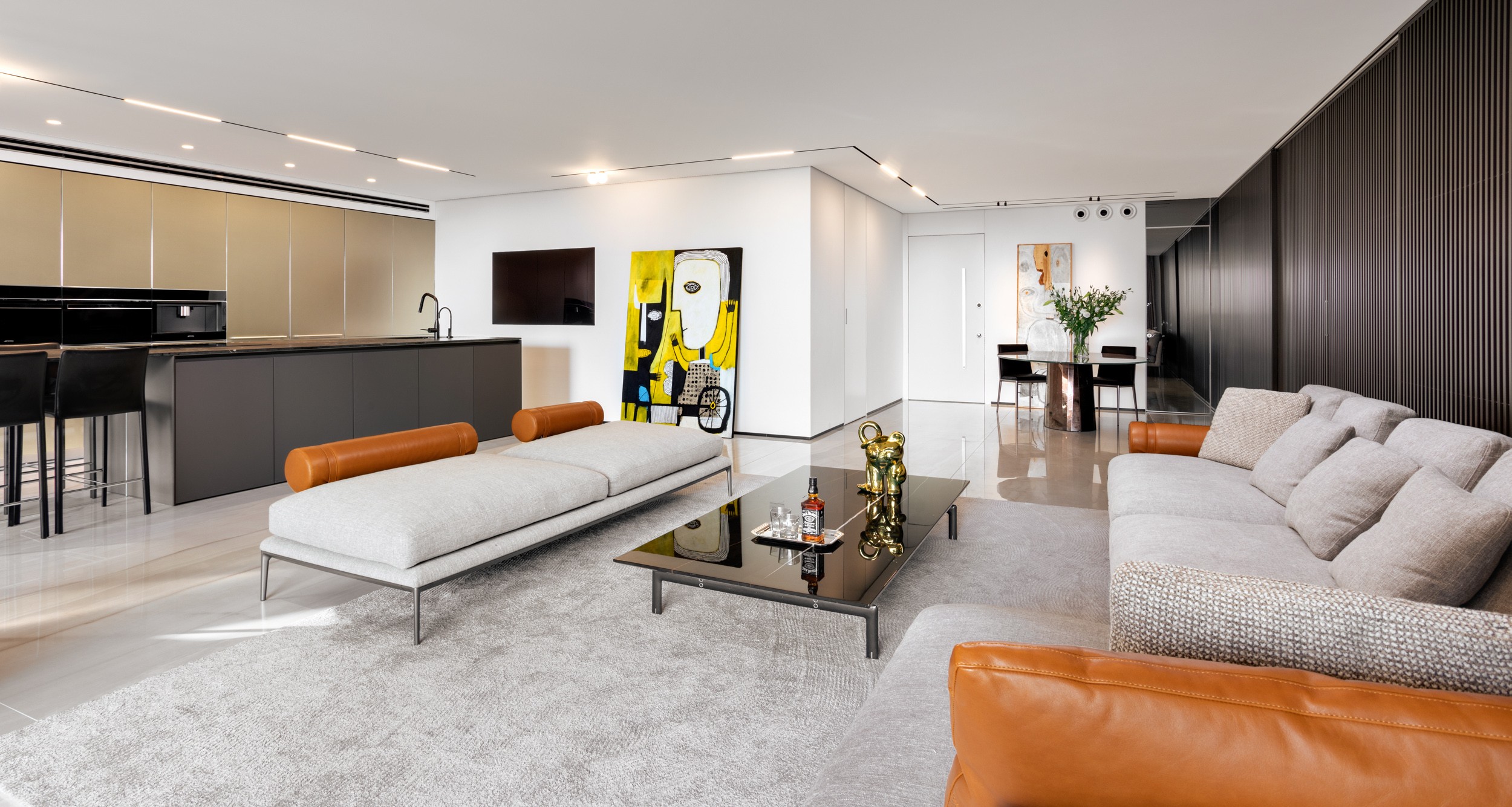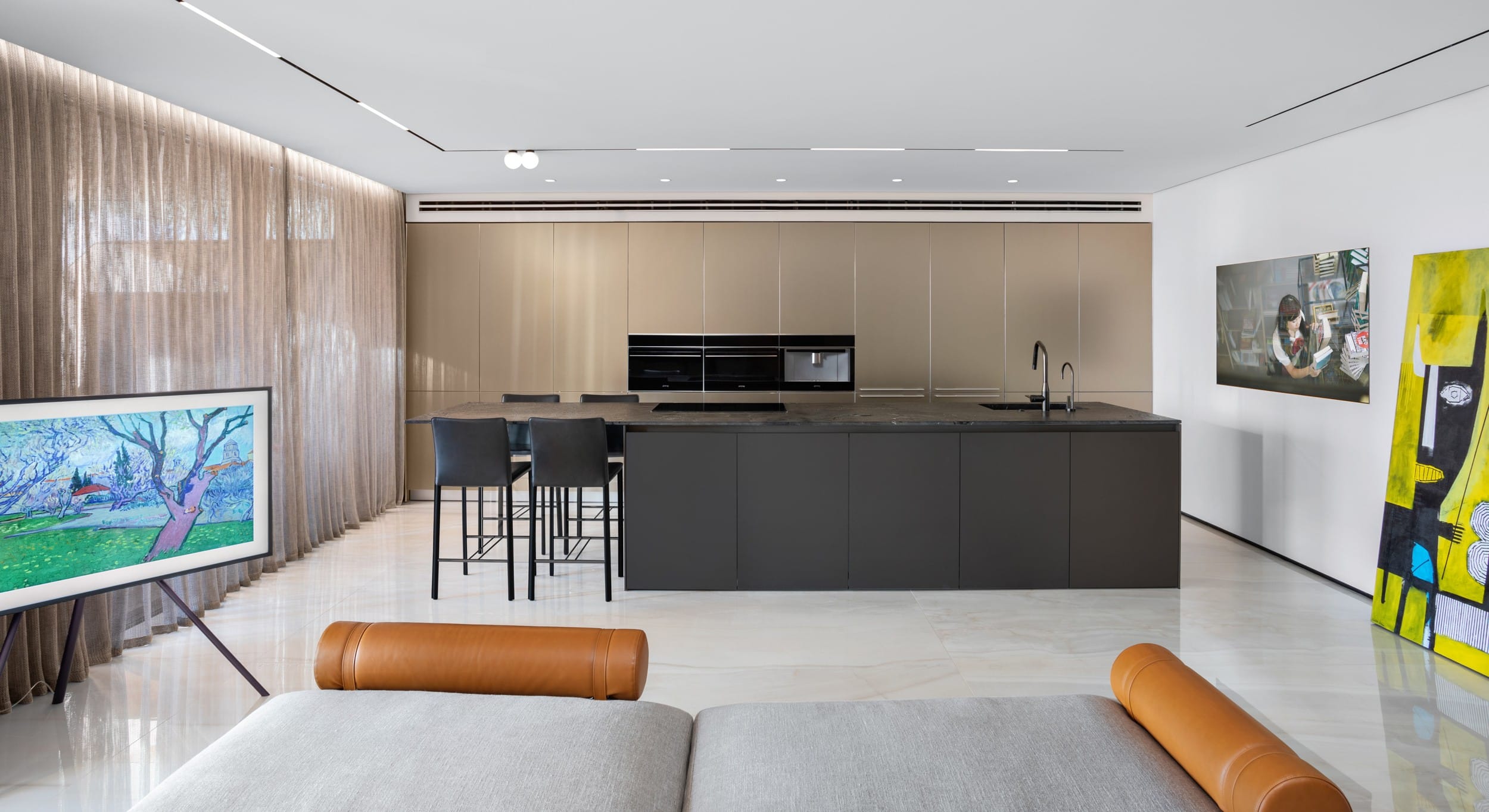 דירה שבה הגאומטריה פוגשת את הרוך , ריצוף מונוליטי יוצר המשכיות טוטאלית והאמנות שוברת את השקט במינון מדוייק, בית שהוא גם גלריה וגם מקום לנשום בו