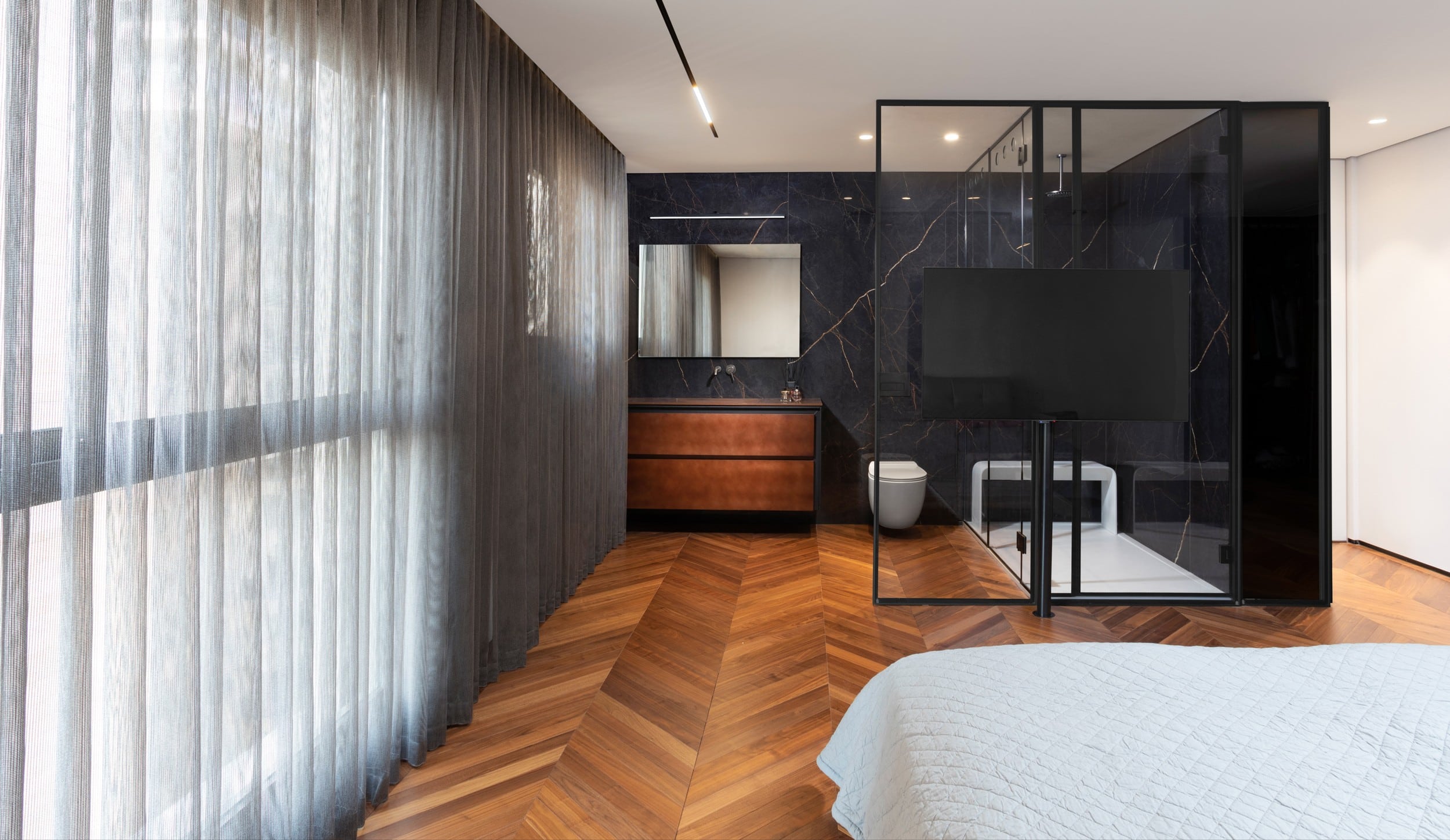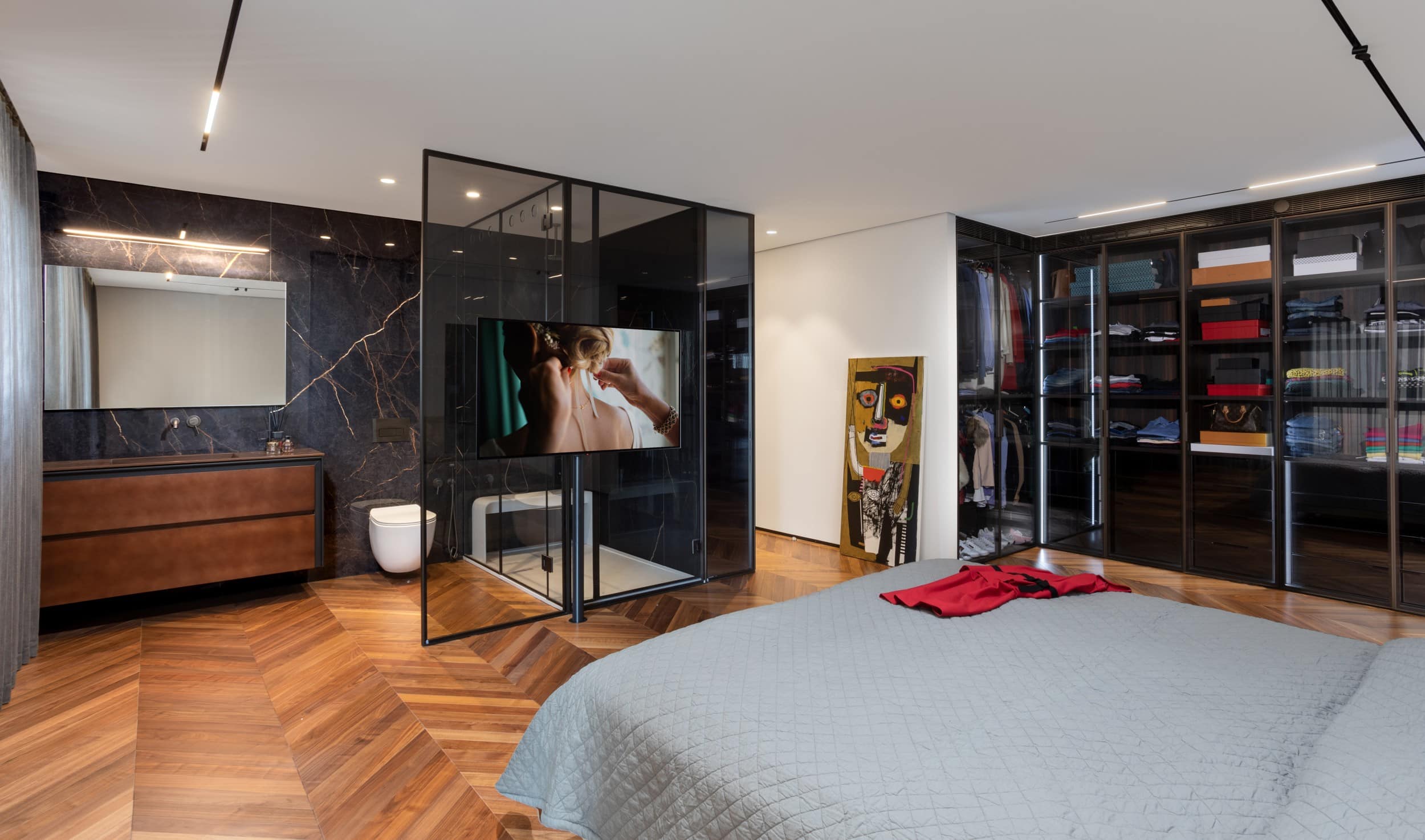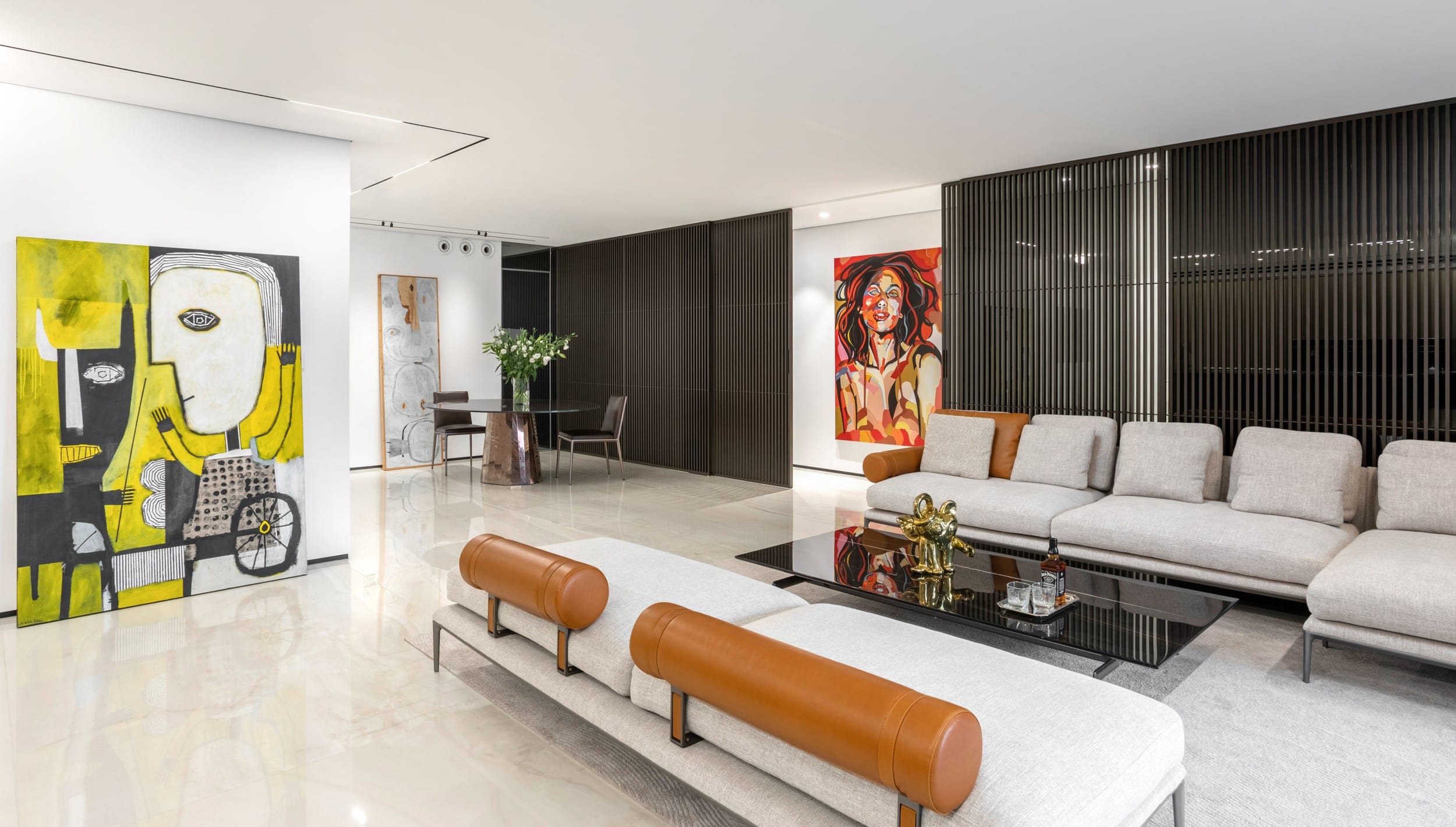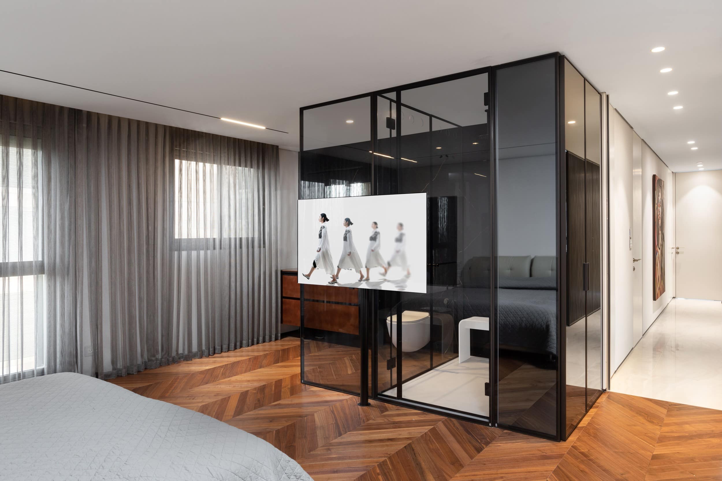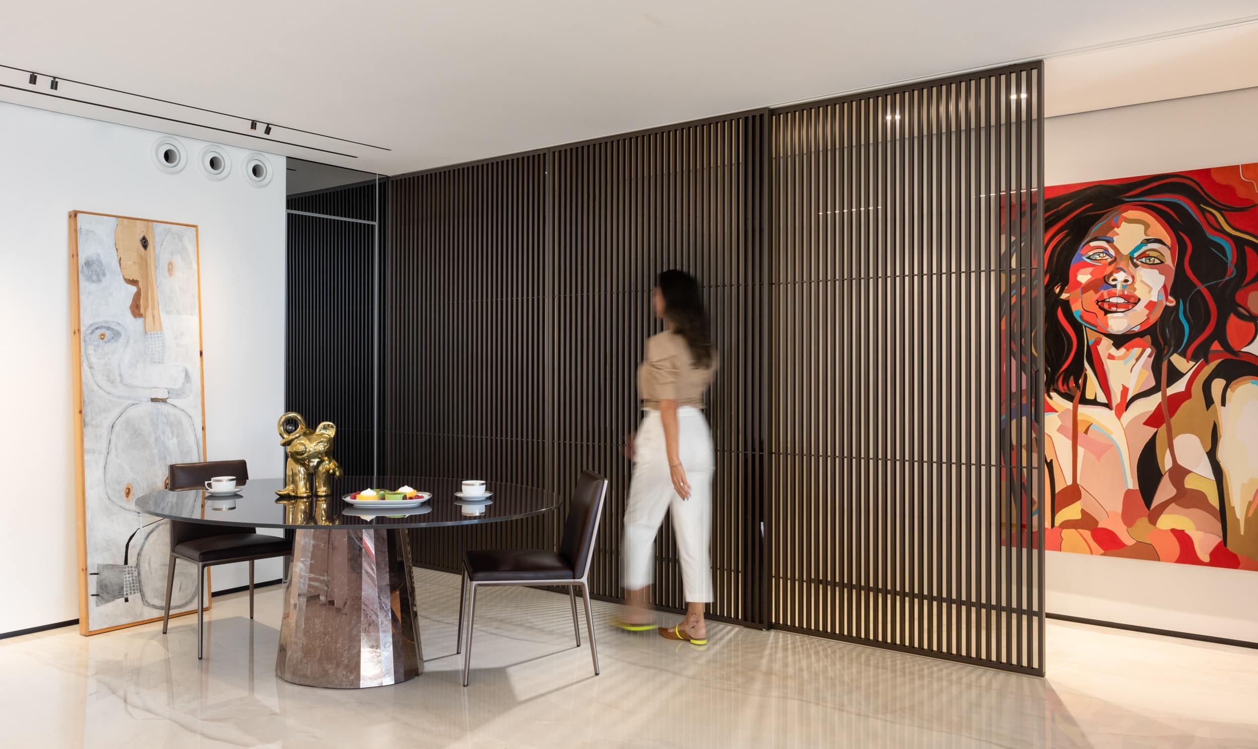 דירה שבה הגאומטריה פוגשת את הרוך , ריצוף מונוליטי יוצר המשכיות טוטאלית והאמנות שוברת את השקט במינון מדוייק, בית שהוא גם גלריה וגם מקום לנשום בו