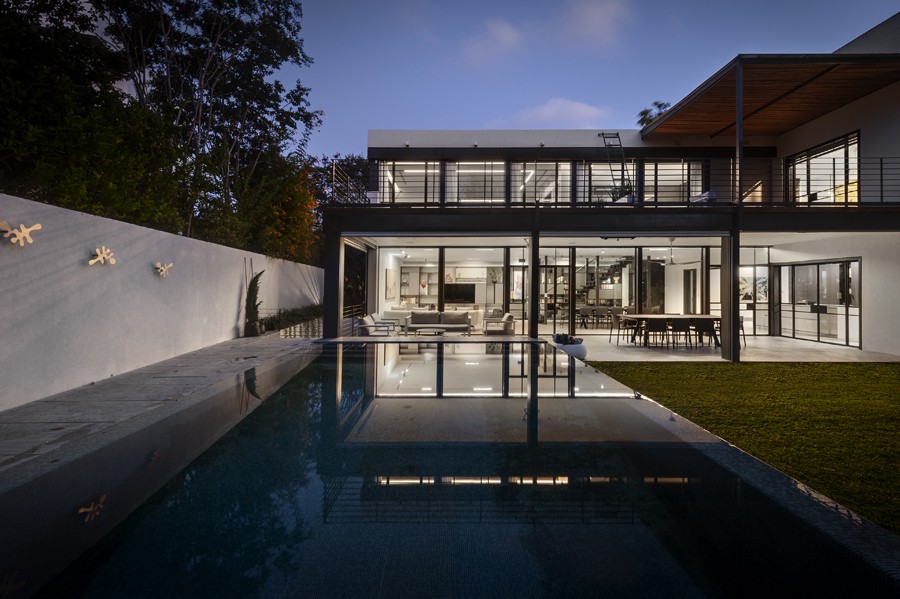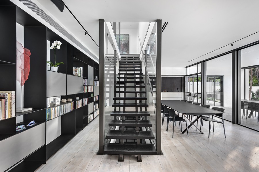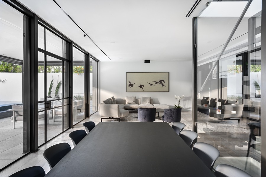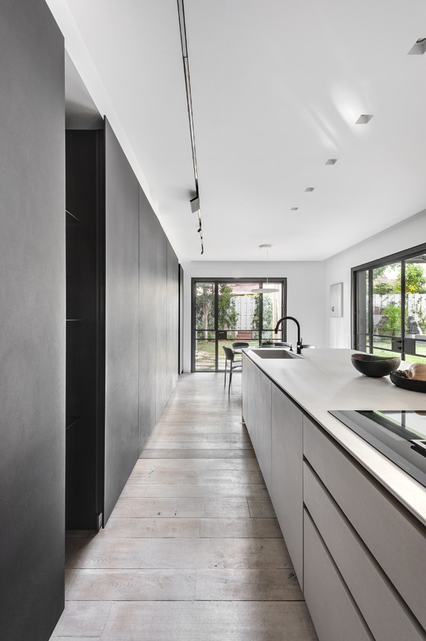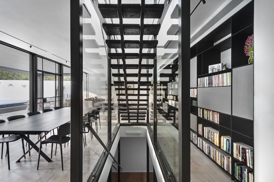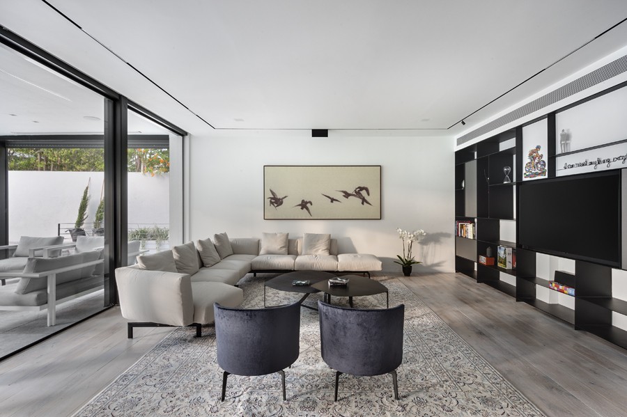 עיצוב מונוכרומטי של שחור, אפור ולבן, מאפיין בית הבנוי בין העצים במרכז הארץ. השפה הכללית מדויקת ורגועה תוך שילוב של אדריכלות מודרנית עם רוך מאופק. החללים פתוחים, מרווחים ומאוזנים ויזואלית, כשנשמר הקשר התמידי בין הפנים לחוץ.