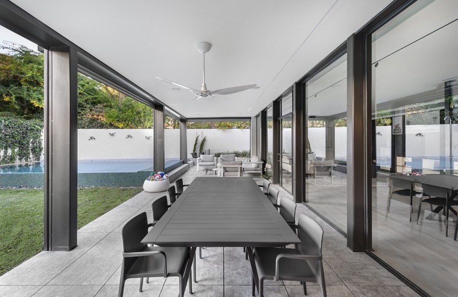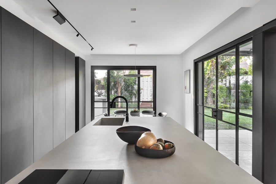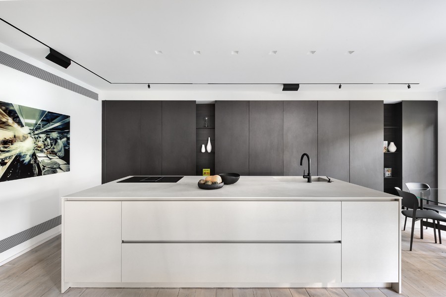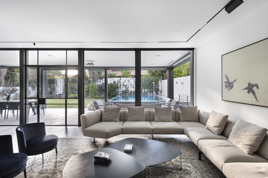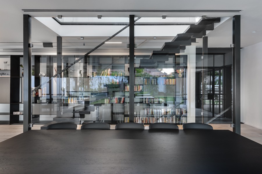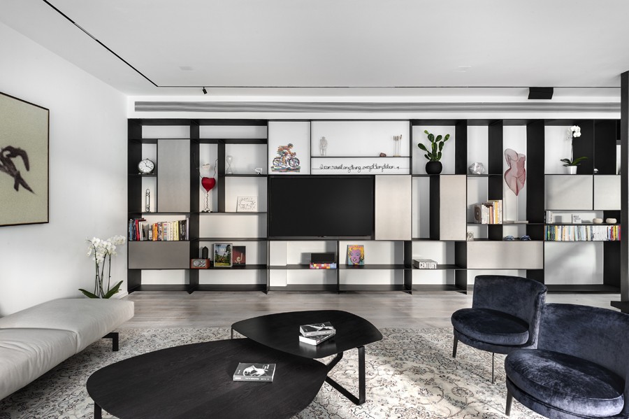 עיצוב מונוכרומטי של שחור, אפור ולבן, מאפיין בית הבנוי בין העצים במרכז הארץ. השפה הכללית מדויקת ורגועה תוך שילוב של אדריכלות מודרנית עם רוך מאופק. החללים פתוחים, מרווחים ומאוזנים ויזואלית, כשנשמר הקשר התמידי בין הפנים לחוץ.