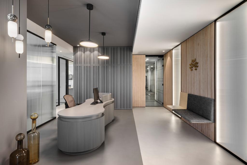 הפרויקט תוכנן עבור משרד הפועל בזירה תחרותית ודינמית, מה שדרש יצירת שפה עיצובית ייחודית המשקפת חזון חדשני. תכנון החלל התבסס על חלוקה מדויקת ושימוש מבוקר בפלטת צבעים וחומרים מצומצמת. התוצאה: מרחב משרדי מינימליסטי ואלגנטי, בו שולבו מערכות נגרות מתקדמות, דלתות מותאמות, ספריות פונקציונליות ועמדות קבלה מוקפדות. המראה המתקבל מדויק, שקט ויוקרתי – כזה שמעביר מסר ברור של מקצועיות ושליטה בפרטים.